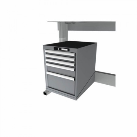 Finework 系列工作臺配件,底座安裝式金屬抽屜櫃,帶全拉出和中央鎖。抽屜高度可選,範圍從 50 毫米至 300 毫米。